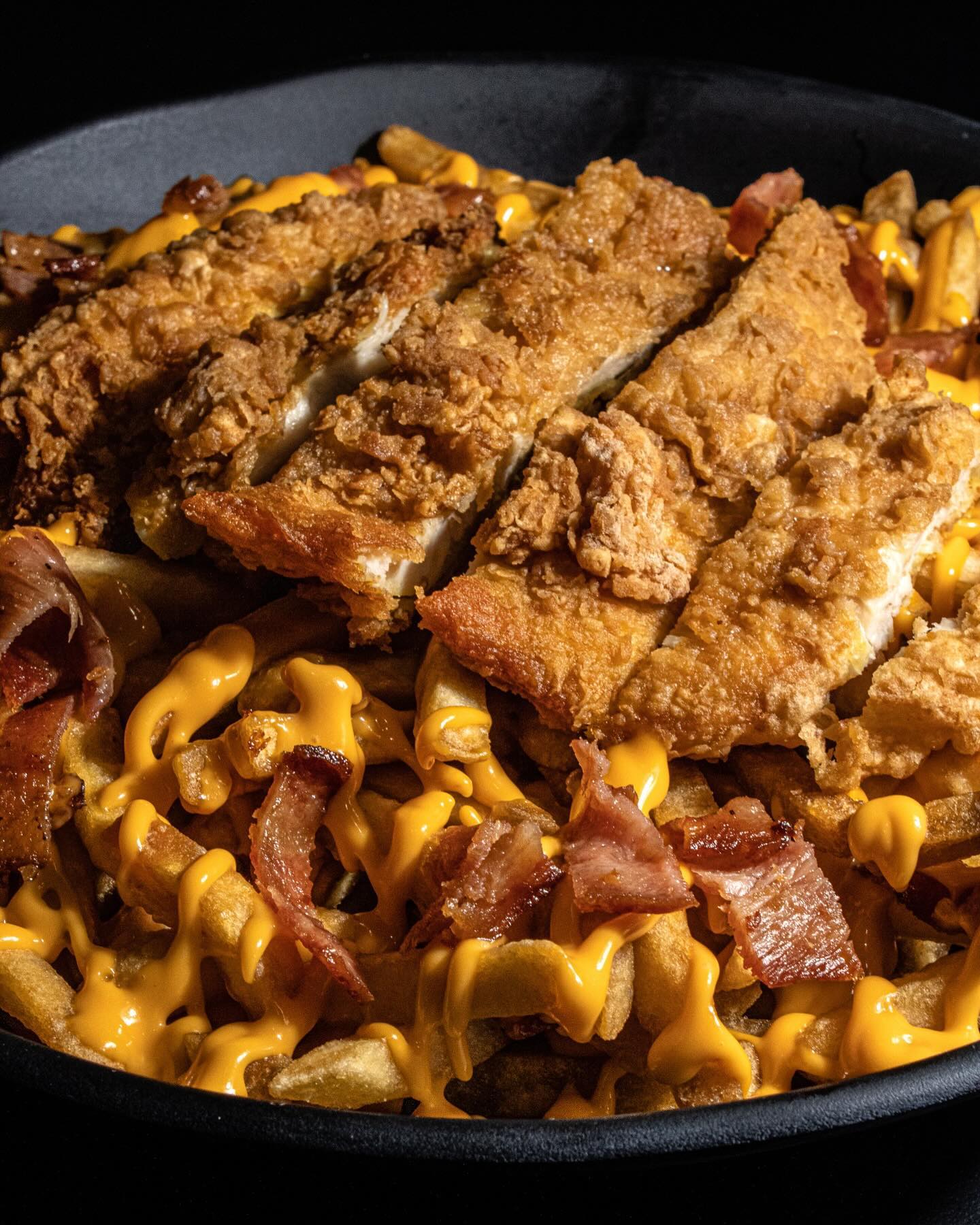 Un clásico de la comida rápida colombiana 🍟🔥. Papas a tu elección, cubiertas con pollo sazonado en trozos, crujiente tocineta y abundante queso cheddar derretido. Una combinación cargada de sabor y perfecta para compartir